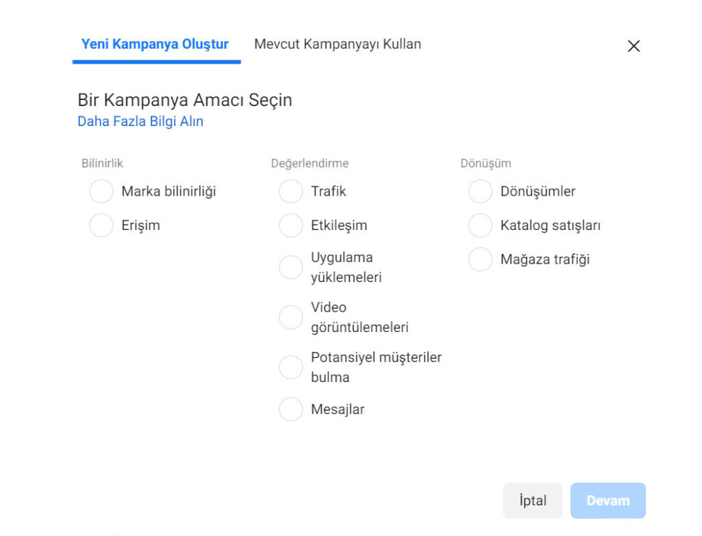 Facebook ve Instagram reklam modelleri en temelde 3 farklı kategoriye ayrılıyor. Bunlar; Bilinirlik, Değerlendirme ve Dönüşüm kategorileridir.